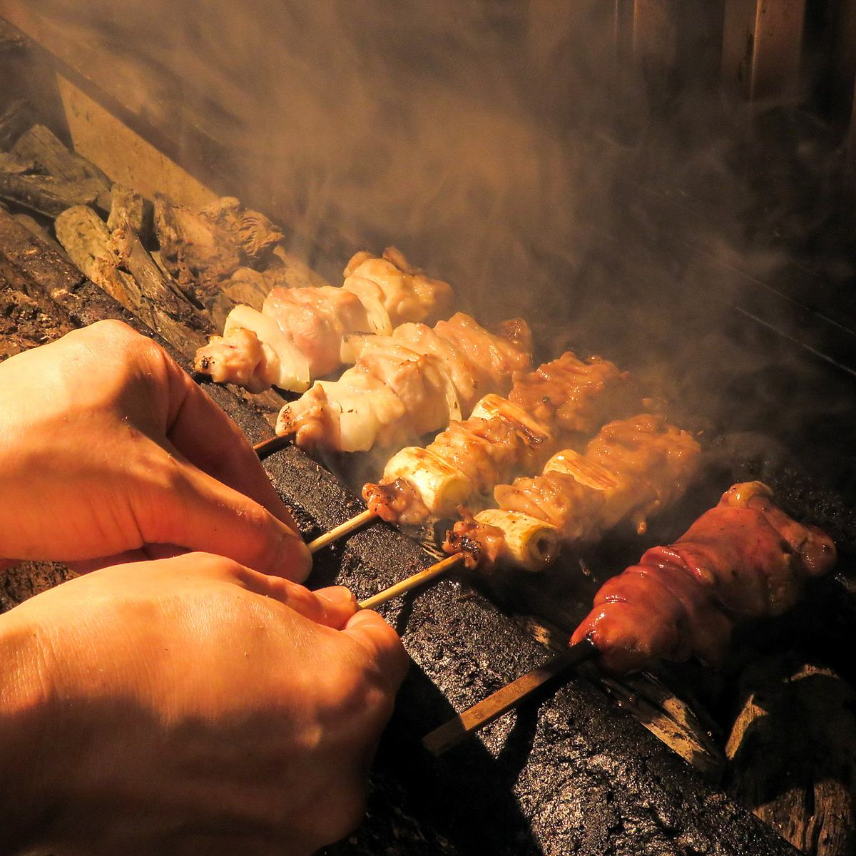 <炭火串焼き>" 紀州備長炭 "でじっくり仕上げる。ジューシーで香ばしい最高の焼き鳥をご提供。
